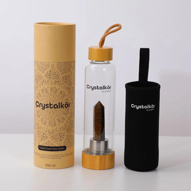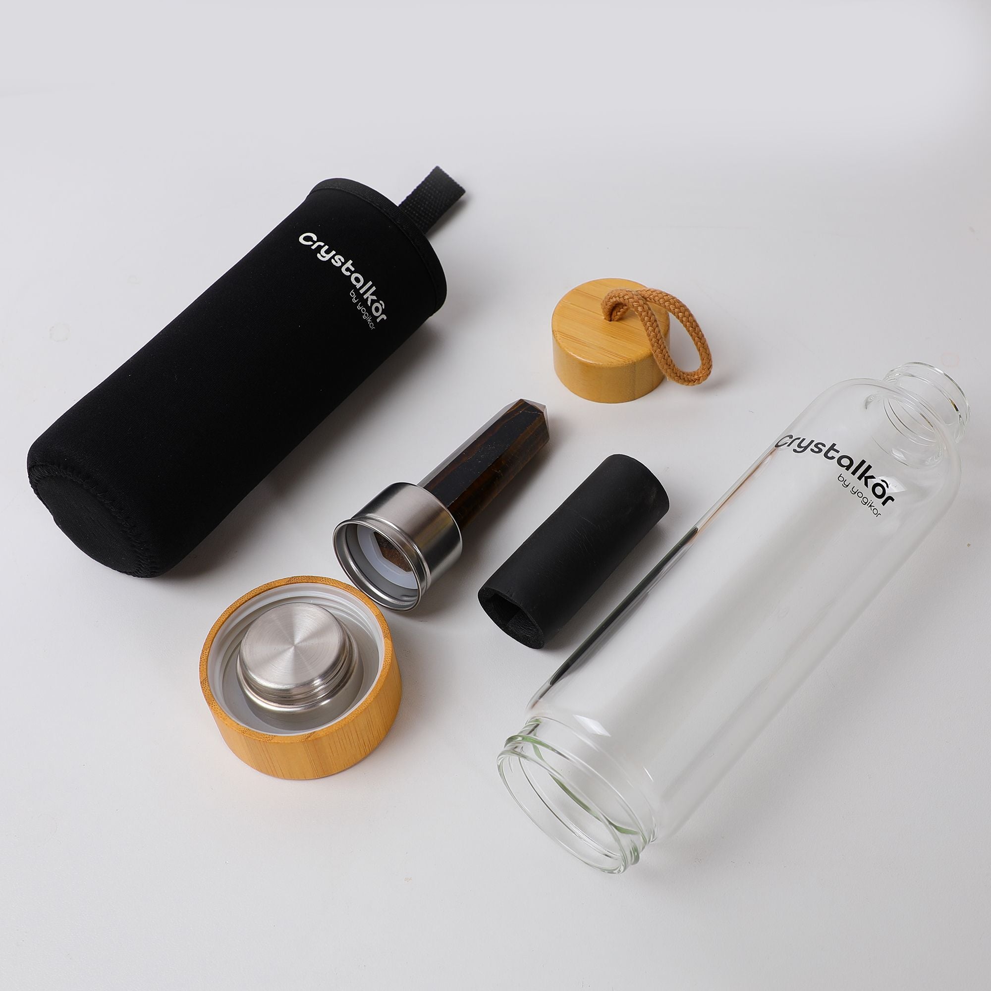 Stay hydrated with intention using the Crystalkor Tiger Eye Crystal Water Bottle. This stunning glass bottle features a natural tiger eye crystal pillar at its core, encased in durable glass with a sleek bamboo cap. Perfect for infusing your water with positive energy, it’s as stylish as it is functional.